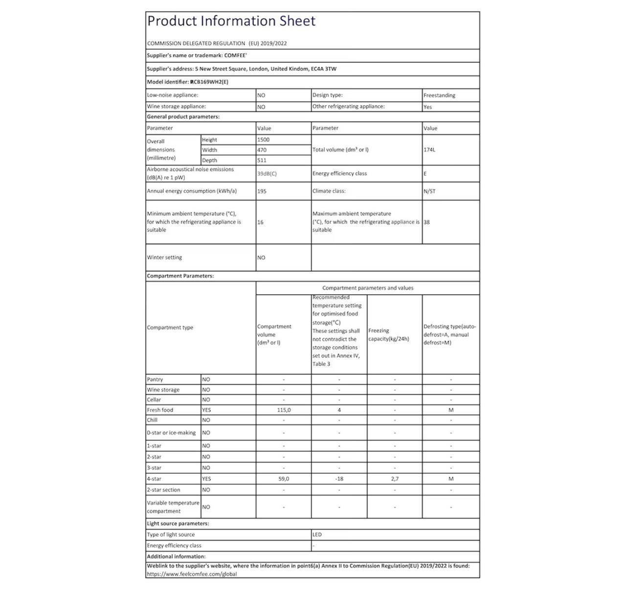 COMFEE' Freestanding Fridge Freezer 174 Litre RCB169WH2(E) Low Frost Fridge with Reversible Door Hinge - Energy Saving LED lights & Adjustable thermostat – Low Noise- White